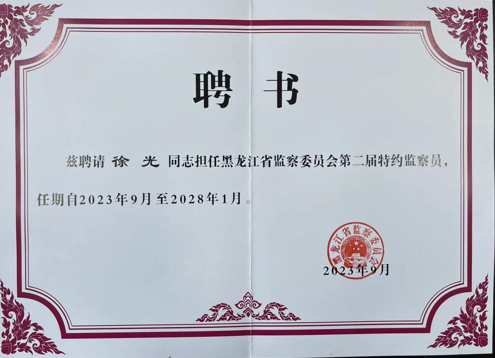为持续深化国家监察体制改革,进一步发挥参谋咨询、桥梁纽带、舆论引导作用和特约监察员监督职能,推动监察机关依法接受民主监督、社会监督、舆论监督。近期,我校经济与管理学院院长徐光同志被聘请为黑龙江省监察委员会第二届特约监察员。
